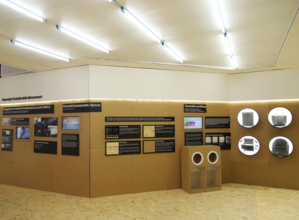 Berdirinya sustainable booth seluas 1.350 m2 ini, menjadi tempat bagi Hyundai untuk menyapa dan memperlihatkan produk dan program unggulan di IIMS 2023. Sisa bahan dari pabrik di antaranya pallet plastik dan kayu, kardus bekas, hingga waferboard.