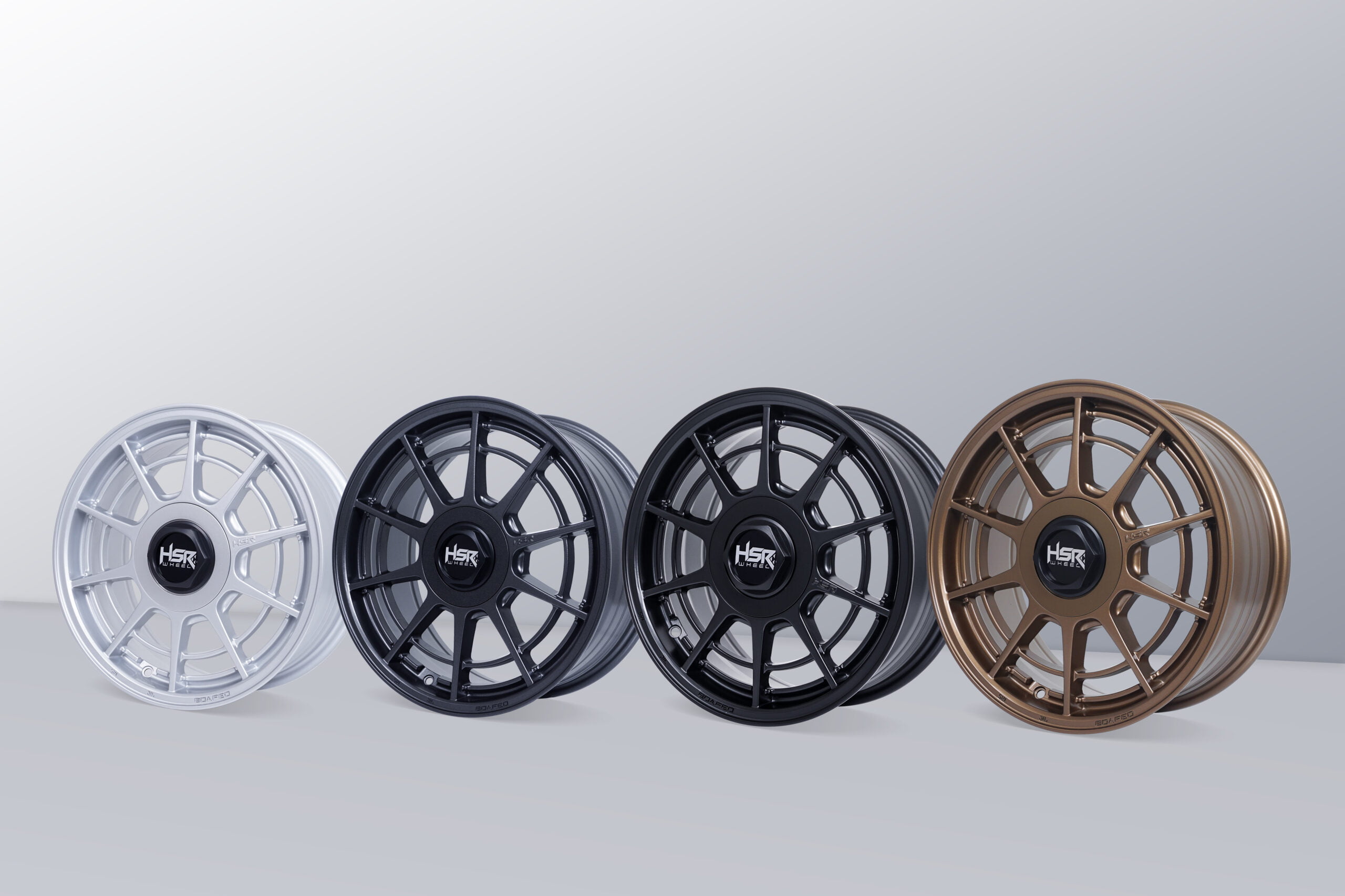 HSR Boafeo tersedia ukuran ring 15, ring 16 dan ring 17 inci. Pilihan lubang PCD 4×100, 4×114,3 dan 5×114,3 dengan ET42. Warna yang dihadirkan antara lain Silver, Bronze, Gun Metal, dan Matte Black.