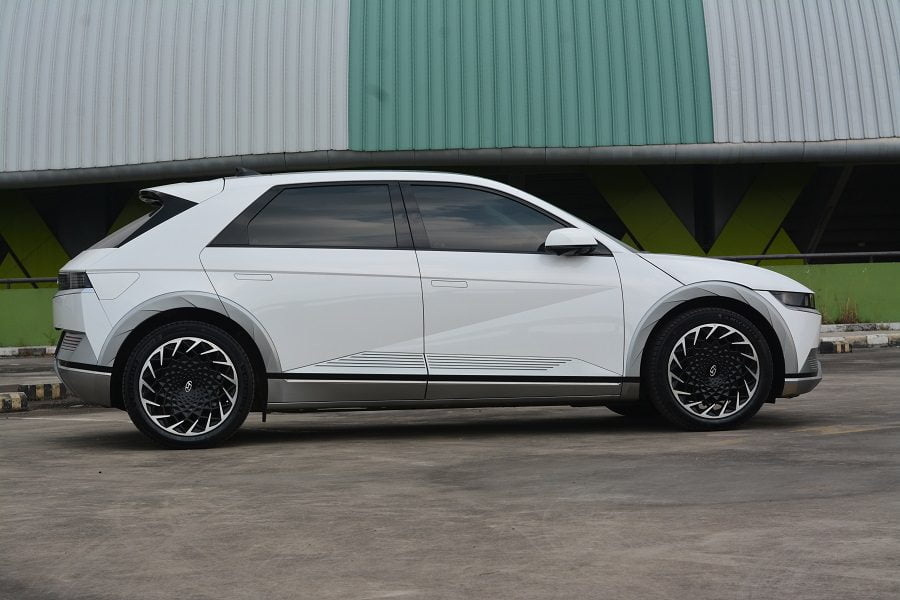 Aura Hyundai 45 EV terasa kental mulai dari fender depan hingga ke bagian belakang. Tampilan samping makin keren, berkat penggunaan velg model full berukuran 20 inci, untuk tipe Ioniq 5 Signature Long Range yang kami coba.