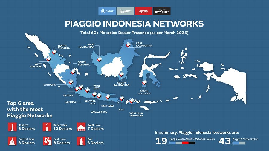 Ketersediaan Motoplex yang luas di berbagai wilayah ini, juga mendukung jangkauan dari berbagai program after sales dari PT Piaggio Indonesia yang memberikan ketenangan dan pengalaman yang worry-free bagi pengguna produk Piaggio Group.