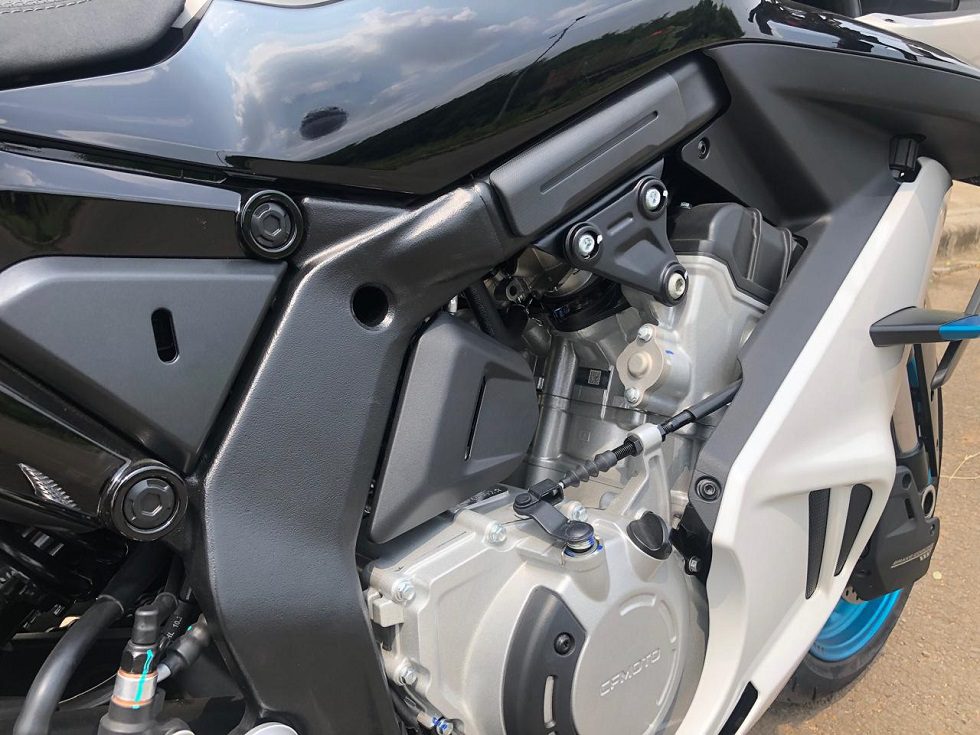 Mesin tiga silinder buatan CFMoto tersebut, menghadirkan kombinasi yang baik antara torsi rendah khas mesin dua silinder dan tarikan panjang bertenaga tinggi khas mesin empat silinder.