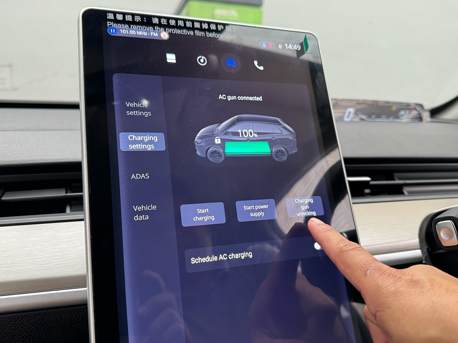 Pada head unit NETA V-II, pilih menu pengaturan mobilku, lalu pilih menu yang di kiri layar, yaitu atur charge atau charging setting, lalu pilih charger buka atau kalau dalam bahasa inggris charger gun unlocking, setelah itu bisa mencoba menarik kembali charging gun yang masih tersangkut.