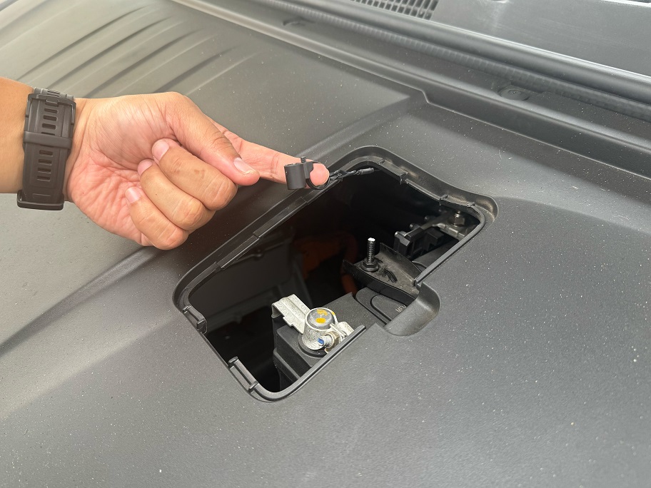 Selain melalui Head Unit, ada cara manual lainnya untuk solusi jika charging gun tersangkut, yaitu dengan membuka kap mesin, lalu di sebelah kanan kap mesin atau di dekat aki, terdapat penutup kotak persegi yang bisa dibuka secara mudah dengan tuas kecil.